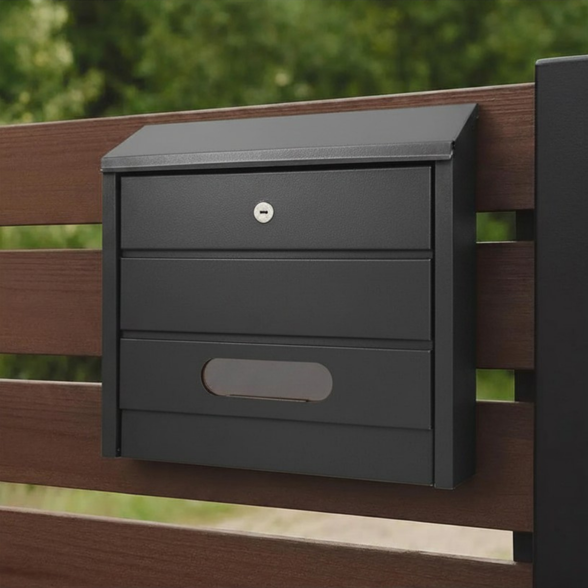 Praktická poštovní schránka v matné antracitové barvě vhodná pro venkovní i vnitřní montáž. Vyrobena z odolného akrylového plechu, který zajišťuje dlouhou životnost a odolnost vůči povětrnostním vlivům. Součástí je zámek se dvěma klíči a montážní sada.